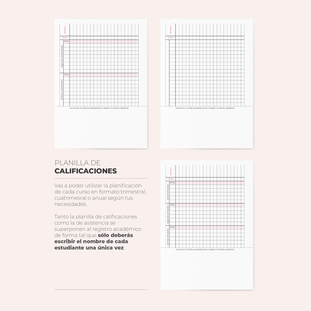 ✅ Planillas de calificaciones (para cursos trimestrales, cuatrimestrales y anuales)